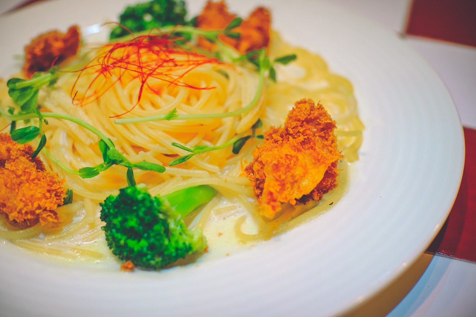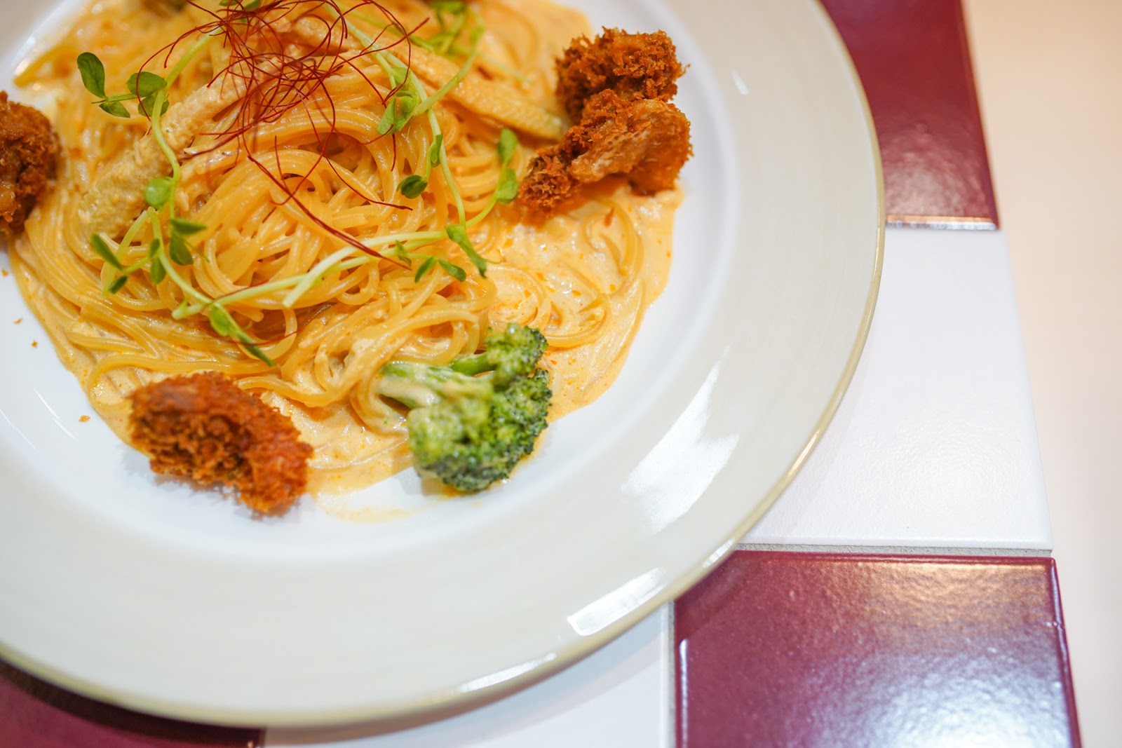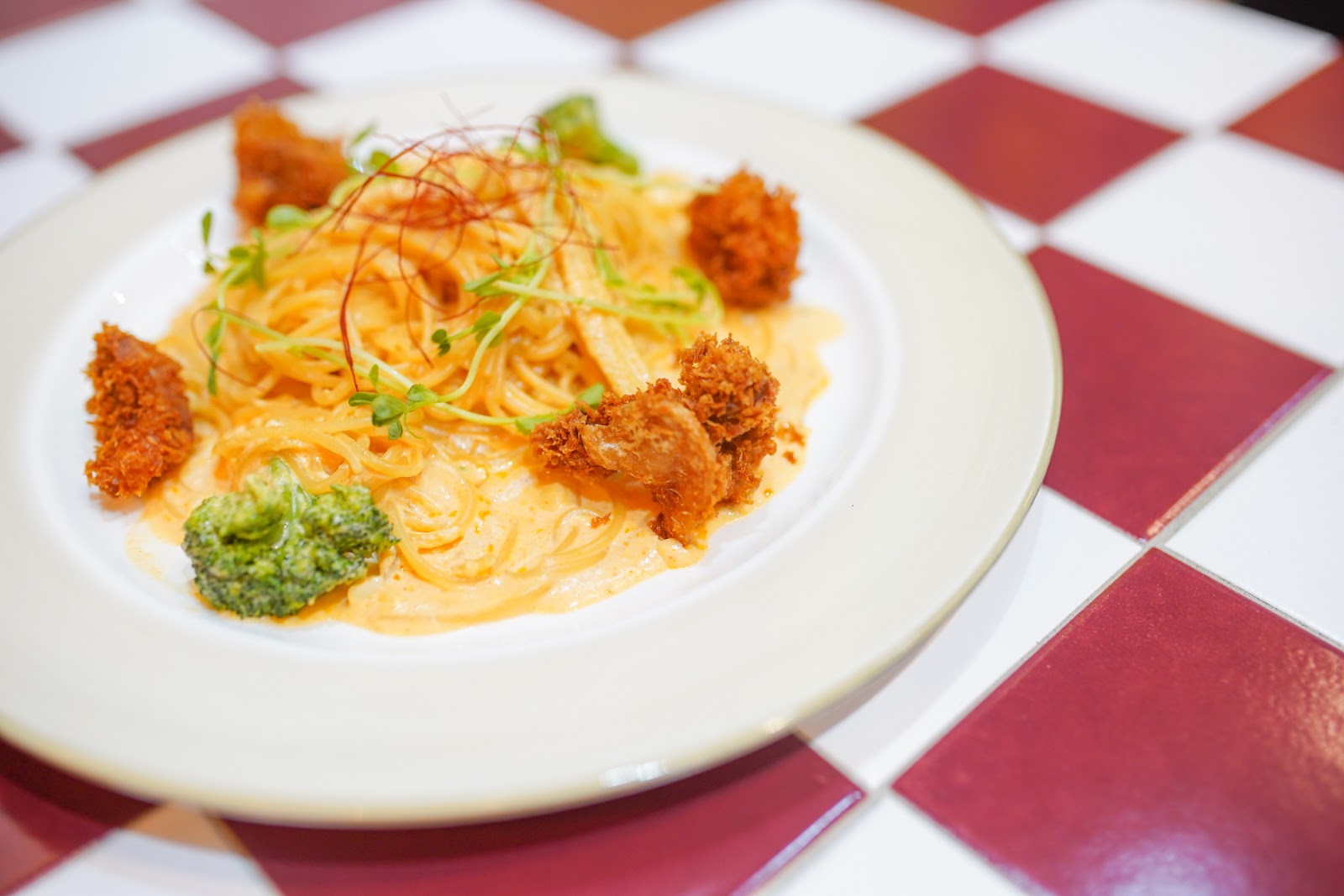 其實就是白醬義大利麵,但是炸雞現炸!蔬菜新鮮,還放上苜蓿芽跟辣椒皮切絲點綴。